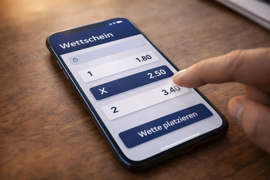 Waehle ein Spiel aus, das dich interessiert. Sobald du darauf klickst, oeffnet sich eine Uebersicht mit verschiedenen Wettmoeglichkeiten. Die einfachste und beliebteste ist die sogenannte 1X2-Wette. Hier tippst du darauf, wer gewinnt: die Heimmannschaft (1), ein Unentschieden (X) oder die Gastmannschaft (2). Neben jeder Option steht eine Zahl, die Quote. Diese Zahl sagt dir, wie viel du bei einem Gewinn zurueckbekommst.